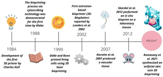 Bioprinting is an emerging and multidisciplinary technology that originated from 3D printing (additive manufacturing) (Figure 1). The first milestone, in 1984, was provided by Charles W. Hull, through the development of three-dimensional printing objects (3D), via stereolithography (SLA). In 1988, the researcher Robert J. Klebe used cytoscribing technology to demonstrate the potential of positioning biological products, using a Hewlett Packard (HP) inkjet printer and a graphic plotter [,,]. Years later (1999), David J. Odde and Michael J. Renn printed living cells using 3D laser bioprinting, thus, demonstrating the feasibility of synthesizing tissues with complex three-dimensional anatomies [,]. In the 2000s, Rolf Muelhaupt and his group reported the first three-dimensional plotting of thermosensitive gels in a liquid medium, using the additive manufacturing technique []. Later, in 2002, the first extrusion-based bioprinter was reported by Landers et al., being marketed under the name “3D-Bioplotter” [,]. In 2003, Boland et al. adapted an HP inkjet printer and were able to successfully print living cells []. In 2006, Suwan N. Jayasinghe and his team added an electro-hydrodynamic jet to deposit living cells []. In 2009, Narotte et al. synthesized vascular tissue based on free scaffolds []. In 2012, Skardal and colleagues performed in situ bioprinting in laboratory mice using cells derived from amniotic fluids to stimulate the healing process. The results indicated that the bioprinting of these cells could be used to treat wounds and burns []. Several types of research have been developed to generate new products for society and overcome the challenges of 3D bioprinting. Zhou et al. (2021), for example, used 3D bioprinting technology to add chondrogenic progenitor cells (CPCs) and fibronectin (FN) to a hydrogel composed of alginate/gelatin/hyaluronic acid (Alg/Gel/HA), intending to optimize the cartilage regeneration process []. Nulty et al. (2021) developed a new bioprinting method for manipulating pre-vascularized tissues in vitro to analyze vascularization and bone regeneration in vivo []. Ramasamy et al. (2021) synthesized an artificial skin using an extrusion-based 3D bioprinter. This research aimed to identify an opportunity to provide full-thickness reconstructed human skin in a reproducible and potentially scalable manner []. Noor et al. (2019) synthesized a custom hydrogel for printing autonomous cellular structures, such as whole hearts with blood vessels [].