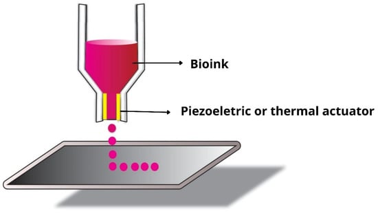 Inkjet bioprinters (drop-on-demand printers) are capable of printing biological materials with optimized speed, accuracy, and resolution (Figure 3) []. They can work with single and multi-ink systems, printing materials with precision and geometric complexity []. Furthermore, they utilize thermal and acoustic (piezoelectric) forces to deposit liquid droplets of defined size, layer by layer []. In the case of thermal force, rapid electrical heating is provided in the bioprinter head, which generates pressure pulses that force the droplets out through the nozzle. This heating can vary between 200 °C to 300 °C without causing damage to the cells [,]. The piezoelectric forces generate an acoustic wave causing the pressure necessary to eject the drop from the nozzle []. For this class of bioprinter, the aim is to use bioinks with low viscosity and cell density. Moreover, bioink gelation must be carried out in situ to avoid nozzle clogging, which is one of its disadvantages [,,]. Yerneni et al. (2019), for example, synthesized solid-phase exosomes using a piezoelectric jet bioprinter, aiming at localized delivery of exosomes into tissues [].