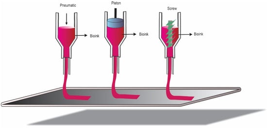 Extrusion-based bioprinting is one of the most used bioprinting techniques today, as it prints bioinks with high viscosity [,,]. In this process, the bioinks are extruded as a thread through the nozzle, using two methods: pneumatic (air) and mechanical (piston and screw) (Figure 4) []. In the pneumatic method, the air pressure provides the force to eject the bioink with pre-established speed and quantity []. However, even though it is a simple procedure, there is a lack of control in bioinks with low viscosity []. The mechanical method determines the printing process through the vertical and rotational forces [,]. In the piston process, the flow is favored over the bioink during printing. For very viscous materials, however, failures occur in the bioink deposition. On the other hand, in screw-based extrusion, bioink is distributed in a microliter range, which can be interesting for materials with low viscosity []. Although extrusion bioprinting is one of the most required for artificial tissues and organs, it has some disadvantages, such as shear stress, which can cause death and/or loss of cell viability, and a low quantity of materials [,]. It is recommended to use more robust hydrogels and improvements in the nozzle and syringe, which would contribute to better cell viability after printing []. In work by Cleymand et al. (2021), a bioink based on chitosan (CH) and guar gum (GG) was synthesized to be used in extrusion-based bioprinters [].