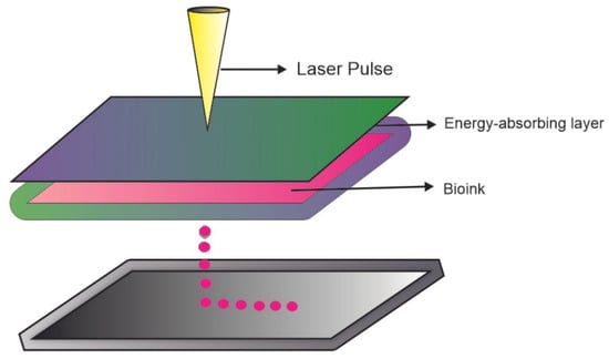 This method does not use a nozzle and contact. The laser passes through a region of three layers: transparent, absorbent, and bioink (Figure 5) []. The transparent region supports the absorbent layer, and the biomaterials are in liquid/gel physical condition to spread more easily []. Three techniques make up this method: matrix-assisted pulsed laser evaporation direct writing (MAPLE-DW), where a low-power pulsed laser with an ultraviolet wavelength is used; laser-induced transfer (LIFT), which uses a high-power pulsed laser and a thin absorbent layer between the donor slide and the bioink; and film-assisted laser-induced direct transfer absorption (AFA-LIFT), which uses a thick absorbent layer that prevents direct interaction between the laser and the bioink []. Furthermore, LAB has a minimal effect on cell viability, and can print hydrogels with varying viscosities [].