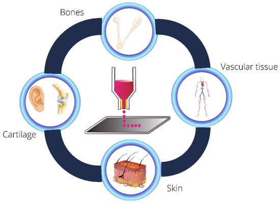 Figure 6 illustrates the main applications of hydrogel-based bioinks, emphasizing soft tissue and bone tissue engineering.