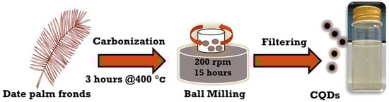 As illustrated in Figure 1, CNPs were synthesized according to published works [,] by carbonizing the date palm fronds at 400 °C for approximately 3 h, followed by high-energy ball milling for 15 h with a rotating speed of 200 rpm; the metallic jar contained four metallic balls of equal weight. The obtained carbon soot weighed around 25 g. Next, carbon powder was poured into DI water and mixed with a magnetic stirrer for 24 h at 70 °C; then, larger carbon particles were allowed to settle down, and the solution was filtered. Finally, the CNP solution was centrifuged at 4000 rpm for 1 h to obtain aqueous hydrophilic CNPs. The concentration of the solution was 16.6 mg/mL, with a measured pH of 7.23. Different concentrations of aqueous CNPs were extensively prepared by diluting them with only DI water as a solvent to analyze the cell viability in response to concentrated CNPs. The synthesis of CNPs was performed at the Center of Nanotechnology, King Abdul Aziz University, Jeddah, Kingdom of Saudi Arabia.