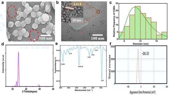 Morphology, structure, and physiochemical characterization of CNPs. (a) The CNPs were imaged using SEM at 100 nm magnification; small particles are highlighted within a red circle. (b) TEM image and HR-TEM at 10 nm displaying crystalline phase of CNPs and interlayer spacing of 3.51 Å. (c) Histogram plot of the measured sizes of CNPs. (d) XRD pattern. (e) FTIR. (f) Zeta potential distribution of CNPs, indicating surface charges and colloidal stability.