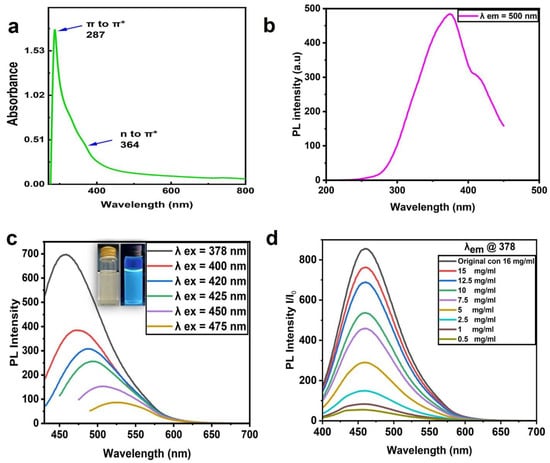 Figure 3a shows the CNP absorption spectra with a sharp peak at 287 nm and a small shoulder at 364 nm. These absorption peaks were attributed to the electron transition levels of π -π* and n-π, revealing C=C and C=O functional groups, respectively [,]. The UV–visible absorption spectra of the CNPs were in good agreement with those of other reports [,]; Figure 3b demonstrates the excitation spectrum at the emission wavelength of 378. Figure 3c depicts the PL emission spectra of the CNPs at different excitation wavelengths, where the wavelength of 378 nm presented the maximum emission intensity at 464 nm. The emission intensity decreased with an increasing excitation wavelength, and the peaks shifted. The aqueous CNPs excited at 365 nm using UV light model: UVP-LLC, UVGL -58(Upland, Ca, USA) emitted a bright blue color, seen in the inset of Figure 3c, which demonstrated fluorescence emission for the prepared CNPs.