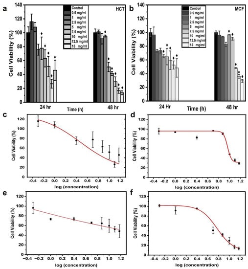 In vitro cytotoxicity and dose-response curve from CNPs. Histograms were plotted for MTT assay results to analyze cell viability upon the application of CNP concentrations of 0.5, 1, 2.5, 5, 7.5, 10, 12.5, and 15 mg/mL. Estimated cell viability % for cell lines (a) HCT116 and (b) MCF7, which were incubated for 28 and 48 h; ♦ indicates statistical significance at p < 0.05 as compared to the control value. The dose-response curves were generated for HCT-116 at (c) 24 h and (d) 48 h and for MCF-7 at (e) 24 h and (f) 48 h with the fitting equation; the curve was plotted as cell viability % (MTT assay) after incubation times of 24 and 48 h versus logarithmic concentrations of CNPs.
