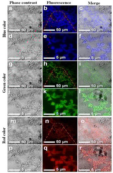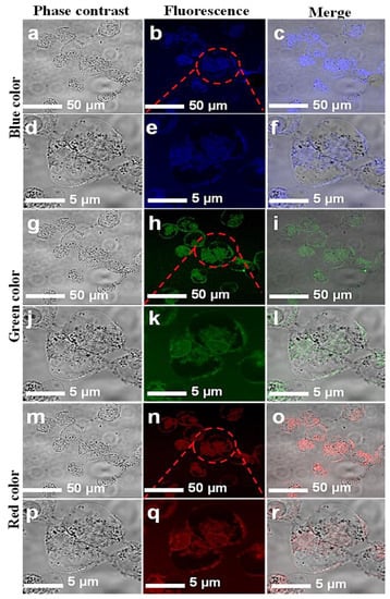 Confocal microscopic images of MCF-7 cell lines with introduced CNPs. Fluorescent confocal images of MCF-7 cells stained with CNPs at 0.5 mg/mL concentration. The images were captured at two different magnifications (50 and 5 µm). Images in the first column (a,d,g,j,m,p) are phase-contrast images; images in the second column (b,e,h,k,n,q) are fluorescence images; and images in the third column (c,f,i,l,o,r) are merged images of phase contrast and fluorescence.