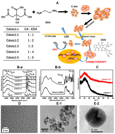 The strategy for the preparation and the mechanism of action of Cdots/DOX complexes are shown in Figure 1A. The Cdots series were synthesized by a hydrothermal method from CA and EDA precursors, where the molar ratio of CA:EDA was from 1:1 to 1:5. DOX binds to Cdots to form Cdots/DOX complexes by π-π stacking and electrostatic interactions. Cdots/DOX complexes enter the cells by diffusion and endocytosis [27,28]. In the acidic environment of lysosomes, DOX is released and then enters into cell nuclei. Cdots can also produce ROS and/or singlet oxygen to kill the cell via PDT [29].