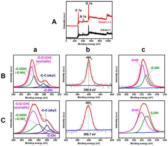 (A) Full-scan XPS spectra of Cdots, and fine and deconvoluted XPS spectra of (B) Cdots1:1, (C) Cdots1:1.5. (a) C1s, (b) N1s and (c) O1s.