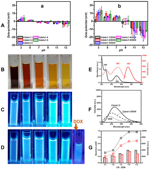 From the emission spectra of both Cdots1:x and Cdots1:x/DOX, quantum yields were calculated and plotted in Figure 3g in comparison with the variation of fluorescence intensities. When the molar ratio of CA:EDA increased from 1:1 to 1:5, the quantum yield of Cdots gradually increased, and the highest quantum yield at 0.40 was obtained as the molar ratio was 1:4. This result qualitatively agreed with a previous report in which Cdots were prepared by a hydrothermal method using different molar ratios of L-ascorbic acid and urea (from 1:1 to 1:8) [19,37]. These results indicate that the nitrogen doping in Cdots plays an important role in their optical properties. After loading DOX, the quantum yields slightly decreased due to quenching by DOX, suggesting the π-π stacking interaction of the aromatic group of DOX with the graphitic structure of Cdots. These tendencies were seen alongside the behaviors of emission intensities.