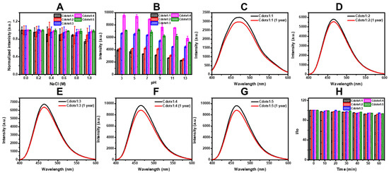 (A) Influence of NaCl (0.5 mL) on emission intensity of Cdots (1 mg/mL, 0.5 mL in water), (B) influence of pH on emission intensity of Cdots, (C–G) emission spectra of fresh Cdots and Cdots (1 mg/mL) after 1-year storage at room temperature, and (H) resistance to photobleaching (fluorescence emission intensity of Cdots (1 mg/mL, 1 mL in water) in phosphate buffer (50 mM, pH 7.5) for 1 h irradiation at 360 nm excitation by a 150 W quartz–xenon lamps).