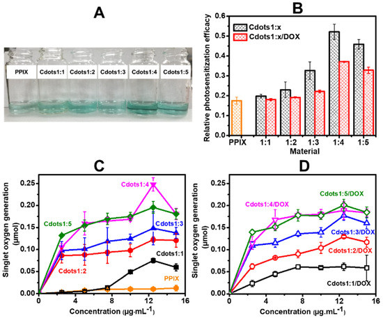 (A) Photographs of Cdots1:x in TMB solution after LED irradiation, (B) oxygen photosensitization efficiency of PPIX, Cdots1:x (black) and Cdots1:x/DOX (red) calculated from absorbance at 655 nm and singlet oxygen generation of (C) PPIX, Cdots1:x and (D) Cdots1:x/DOX. The original data of (B–D) are shown in Figure S5.