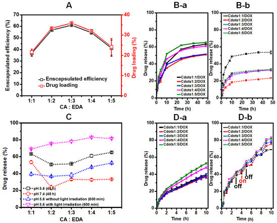 (A) Encapsulation efficiency and drug loading of Cdots1:x, release profiles of Cdots1:x/DOX in PBS buffer (B) without light irradiation at (a) pH 5.6 and (b) pH 7.4, (C) drug release (%) plot of Cdots1:x/DOX as a function of CA:EDA in different conditions, and (D) at pH 5.6 (a) without light irradiation and (b) with light irradiation.