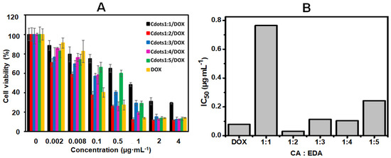 For in vitro tests, HeLa cells were treated with Cdots1:x/DOX and free DOX as a control, and the MTT assay was used to measure the cytotoxicity. To evaluate the effect of DOX on the in vitro cell culture, HeLa cells were treated with several DOX concentrations bounded in Cdots1:x, ranging from 0.002 to 4 µg·mL−1. As seen in Figure 7A, the viability of HeLa cells was over 95% at a DOX dose of 0.002 µg·mL−1, and it gradually decreased below 20% as the concentration of DOX increased. A similar tendency was also observed for all Cdots1:x/DOX, although the viability was lower for Cdots1:2/DOX than for Cdots1:1/DOX, but it increased with the increase from Cdots1:2/DOX to Cdots1:5/DOX. Both Cdots1:x/DOX complexes and free DOX caused dosage-dependent death of Hela cells after 48 h incubation [37].