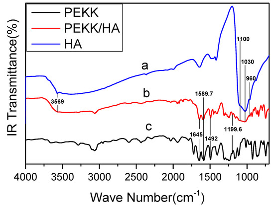 The characteristic peak at ~1645.0 cm−1 is due to the carbonyl groups connecting two benzene rings, while the peaks around 1199.6, 1492.0, and 1589.7 cm−1 are due to the ether bond between two benzene rings. All these peaks can be observed for the PEKK/HA composite, indicating that it contains PEKK.