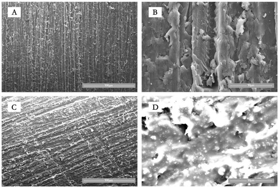 SEM images. (A,B): Pure PEKK. (C,D): PEKK/HA composite [35].