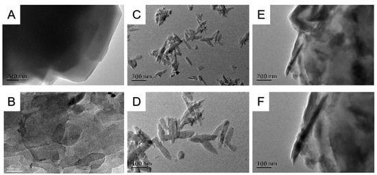 TEM images. (A,B): Pure PEKK. (C,D): Pure HA. (E,F): PEKK/HA composite.