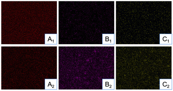 EDS elemental mapping results showing the distributions of (A1) carbon in PEKK; (A2) carbon in PEKK/HA; (B1) calcium in PEKK; (B2) calcium in PEKK/HA; (C1) phosphorus in PEKK; and (C2) phosphorus in PEKK/HA. All images are 10 μm × 10 μm.