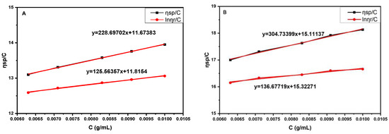 ηsp and lnηr/C were plotted against C according to Equations (2) and (3), where the intercept is the intrinsic viscosity, and this can be used to calculate the viscosity average molecular weight of PEKK according to Equation (1). The original data obtained through the test were drawn and analyzed with ORIGIN software.