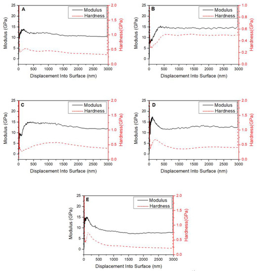 Average indentation modulus and hardness values for five different points (A–E) on the same sample.