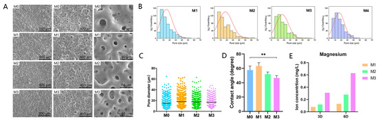 (A) Surface morphology observation of four samples at different magnifications. (B) Frequency distribution of pore size. (C) Pore size and (D) wettability of four substrates. (E) Accumulated Mg ion released from different specimens (** p < 0.01).