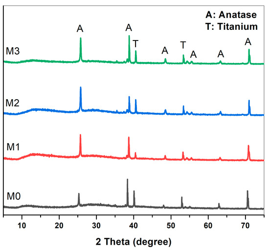 X-ray diffraction (XRD) analysis was performed on various samples to determine the crystallinity of the titanium dioxide layer. As shown in Figure 2, typical peaks of titanium and anatase TiO2 phase were detected on the four titanium surfaces. In general, there were no significant alteration in surface morphology, wettability and phase composition of these coatings after magnesium was incorporated.