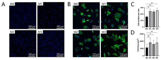 The results of cell adhesion and spreading are shown in Figure 3A,B. After cells were incubated on the samples for 24 h, more attached cells were observed in the magnesium-incorporated groups than in the control group. The statistical analysis showed that there were no significant differences among the magnesium-incorporated groups. As shown in Figure 3C,D, the coverage area of attached cells was significantly larger in groups M1, M2, and M3 than in the group M0. There were no significant differences among groups M1, M2, and M3.