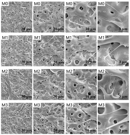 EDS analysis was performed to examine the chemical composition of titanium surfaces. As illustrated in Table 1, oxygen and titanium were the main elements on the four titanium substrates. Both Pi and Ca were detected in the four groups, with small differences among them. No magnesium was detected in group M0, while it was detected in the magnesium-containing electrolytic treatment groups. The magnesium percentage was 0.87 ± 0.16, 1.72 ± 0.04, and 2.51 ± 0.04% for groups M1, M2, and M3, respectively.