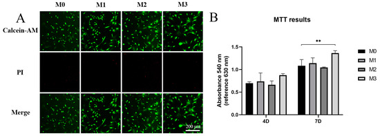 The live/dead assay results are presented in Figure 5A. The majority of cells were alive, and few dead cells were observed on the titanium surfaces, suggesting good biocompatibility for cell growth. The results of the MTT assay, shown in Figure 5B, represent total cell metabolic activity. After 4 days of culture, no significant differences were observed between Mg-free and Mg-incorporated titanium oxide surfaces. After 7 days of culture, total cell metabolic activity was higher on the M3 titanium surface than on the other three (M0, M1, and M2). The addition of magnesium showed good biocompatibility for cell viability, while a high magnesium content improved cell metabolic activity.