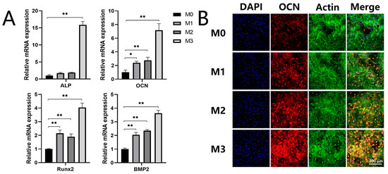 (A) Expression of osteogenic-related ALP, OCN, Runx2, and BMP2 genes. (B) Immunofluorescence staining for OCN protein (** p < 0.01, * p < 0.05).