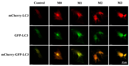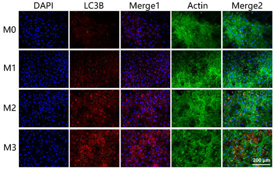 To further elucidate the effects of incorporated magnesium on the autophagy flux of cells cultured on titanium dioxide surfaces, BMSCs were transfected with mCherry-GFP-LC3B adenovirus. Typical images in Figure 8 show that co-localization of mCherry-LC3B and GFP-LC3B dots was higher in groups M1, M2, and M3 compared to M0, indicating a higher level of autophagy. The M3 coating showed the strongest co-localization of mCherry-LC3B and GFP-LC3B dots.