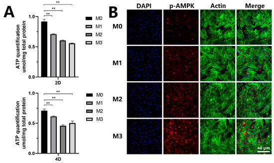 (A) Intracellular ATP level. (B) Immunofluorescence staining for p-AMPK protein (** p < 0.01).
