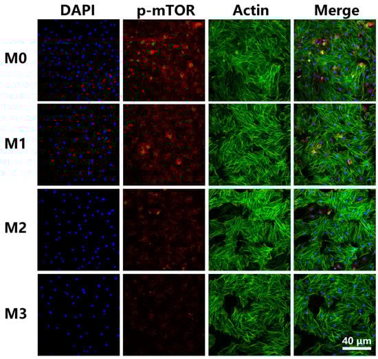 The detection of the p-mTOR protein is shown in Figure 10. The fluorescence intensity of p-mTOR protein was obviously less pronounced in groups M1, M2, and M3 compared to M0. The M3 coating showed the lowest p-mTOR protein expression among the four specimens. The incorporated magnesium downregulated cellular energy levels in the process of enhancing osteogenic differentiation, then activated AMPK and inhibited mTOR, subsequently initiating autophagy. Taken together, these data point out that the AMPK/mTOR signaling pathway plays a vital role in autophagy-induced osteogenic differentiation regulated by magnesium.