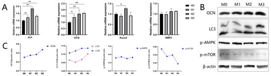 (A) Expression of osteogenic-related genes, ALP, OCN, Runx2, and BMP2. (B) Western blotting for OCN- and autophagy-related proteins. (** p < 0.01, * p < 0.05) (C) The gay value ratio of OCN- and autophagy-related proteins to β-actin.