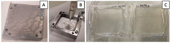 Hybrid membrane production steps: decellularized tissue is gently fixed into the metallic frame (A); polymer solution is poured onto the tissue (B); and, after 3 days at 38 °C in a vacuum oven, the membranes are removed from the frame (C).