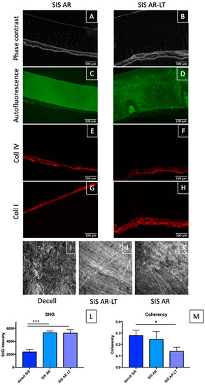 Phase contrast of hybrid membranes: SIS AR (A) and SIS AR-LT (B). Autofluorescence (green channel) shows the polymers AR (C) and AR-LT (D), respectively. Collagen IV and collagen I are shown, respectively, in (E,F) and (G,H) for both SIS AR and SIS AR-LT. Z-stack of max intensity of phase contrast of decellularized SIS, SIS AR, and SIS AR-LT are shown (I–K). SHG intensity values from z-stack measurements (n = 3) (L) and coherency analysis from z-stacks (n = 3) (M) are presented. Data on histograms show mean ± SD. Data analyzed by Dunnett’s multiple comparisons test (decellularized tissue was used as control group). * p < 0.05, *** p < 0.001.