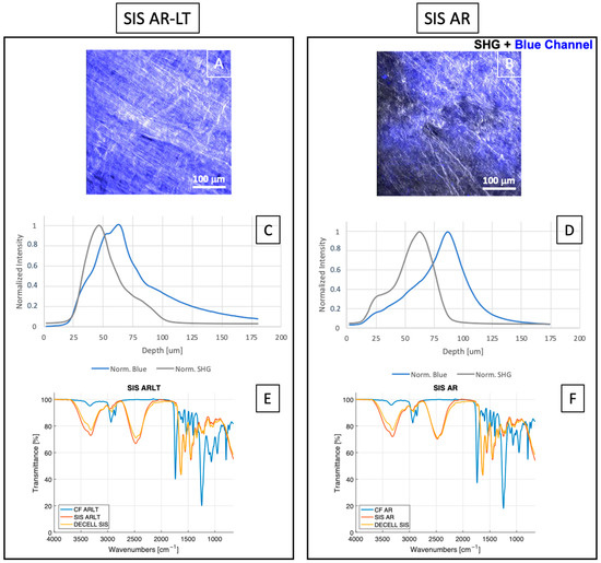 Merge of z-stacks of phase contrast and autofluorescence (blue channel) images (A,B) of both hybrid membranes. Graphs of normalized intensities of SHG and blue channel for SIS AR-LT (C) and SIS AR (D). FTIR spectra of decellularized SIS, CF ARLT, and SIS AR-LT (E) and decellularized SIS, CF AR and SIS AR (F) are reported (n = 3 for each group), showing transmittance (%) over the wavenumbers (cm−1).