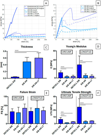 Tests were executed at room temperature, and specimens were kept wet with saline solution. Specimens were pre-loaded up to 0.1 N, then elongated (0.2 mm/s) to breakage. Decellularized SIS, SIS AR, and SIS AR-LT samples were tested along the circumferential and longitudinal directions as described in our previous study [32].