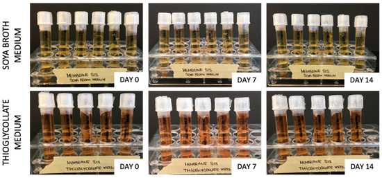 Samples (each in duplicate) of sterilized hybrid membranes (SIS AR and SIS AR-LT) were treated according to the European Pharmacopoeia guidelines [48]. Thioglycollate medium (cat no. T9032, Sigma-Aldrich, Saint Louis, MO, USA) and soybean–casein digest medium (cat no. 22092, Sigma-Aldrich, Saint Louis, MO, USA) were used to detect the presence of aerobic/anaerobic bacteria and fungi. Turbidity was visually assessed and images were taken at days 0, 7, and 14.
