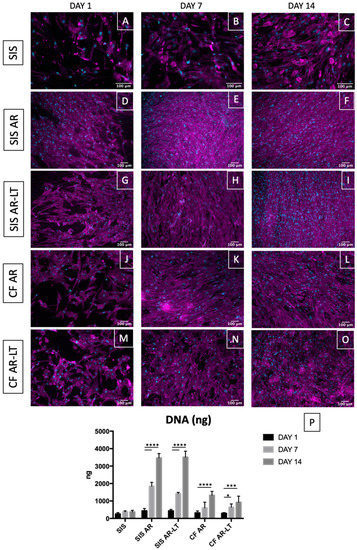 Decellularized SIS, SIS AR, and SIS AR-LT from the tissue side and CF AR and CF AR-LT alone were seeded with human bone marrow cells (MSCs) and analyzed after 1, 7, and 14 days from seeding. Nuclei and F-actin were marked with DAPI and phalloidin, respectively (Figure 6A–O). Clear cell growth was demonstrated in each tester: it was more prominent over the hybrid membranes and slightly lower over the polymers. This result was supported by DNA quantification (Figure 6P), which demonstrated an increase of DNA for all samples (SIS, SIS AR, SIS AR-LT, CF AR, and CF AR-LT) from day 1 to day 7 and day 14 but with a more noticeable increase in the case of SIS AR and SIS AR-LT compared to SIS and to both polycarbonate urethanes alone.