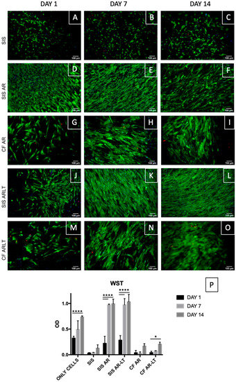 Live/dead staining on seeded SIS, SIS AR, and SIS AR-LT and CF AR and CF AR-LT at days 1, 7, and 14 (A–O). Limited number of dead cells (in red) were found while an increase in live cells (in green) was found. Nuclei were stained with Hoechst in blue. Optical density values (OD) for SIS, SIS AR, and SIS AR-LT and CF AR and CF AR-LT are reported (n = 3) (P) showing a significant difference between days 1 and 14 in control group (only cells) and between days 1 and 7 and days 1 and 14 in both hybrid membranes using Dunnett’s multiple comparison test to compare day 7 and day 14 to day 1 (control). Data show mean ± SD, * p < 0,05, **** p < 0.0001.