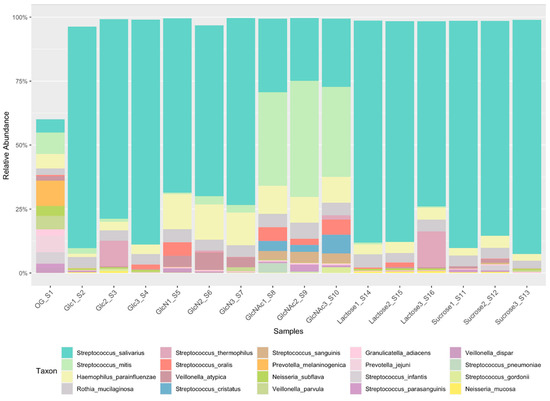 Relative abundance of most common species identified in CCS biofilms formed under different carbohydrates.