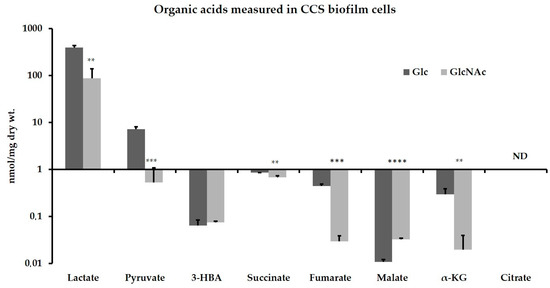 Considering the effect of GlcNAc on the biodiversity of the CCS biofilms, we collected bacterial cultures from 2-day-old biofilms formed on glucose or GlcNAc and subjected them to targeted metabolomic analysis. Measurements of 8 organic acids that are commonly produced during bacterial metabolism and the citric acid cycle are presented in Figure 2. Among all 8 organic acids measured here, lactate had the highest concentration, followed by pyruvate. Acetate was not included in the package offered by the service. Consistent with the fact most of the oral streptococci lack a complete citric acid cycle, several acids were detected in very low levels, namely fumarate, malate, α-ketoglutarate, and citrate. 3-hydroxybutyrate is a substrate for the synthesis of polyhydroxybutyrate, which serves as an energy reserve in certain bacteria including lactic acid bacteria [30,31]. Compared to glucose-grown samples, biofilms formed on GlcNAc yielded significantly lower levels of lactate as well as pyruvate. Our previous research in S. mutans has indicated similarly lower lactic acid production in cells growing on GlcNAc; however, the same cells also produced greater amounts of pyruvate compared to glucose conditions [13]. GlcNAc-grown biofilms also produced significantly lower amounts of succinate, fumarate, and α-ketoglutarate, but slightly higher levels of malate. Together, these results indicated a metabolic shift in the microcosm biofilm caused by GlcNAc, including a reduction in the production of lactic acid, a finding that was consistent with the expansion of mitis group streptococci which are considered beneficial to dental health.