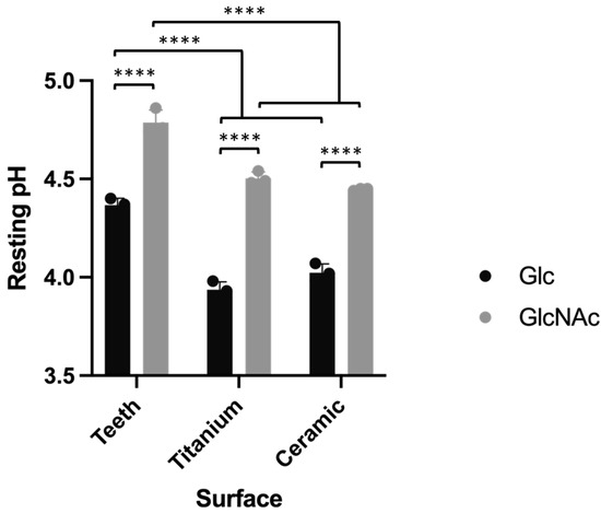Biofilm accumulation can be increased by changes in the topography and roughness of restorative materials and teeth, which is associated with increased risk for periodontal diseases and caries, in the least affects aesthetics of teeth and ceramics. In the early stages of biofilm accumulation, bacteria accumulate in pits and grooves and then spread over the surface of the tooth [39]. It has been suggested that polishing should result in a final surface roughness below the Ra threshold of 0.2 µm for the clinical acceptability of restorative materials [40]. As such, when polishing enamel or titanium, extra care must be taken in order to reduce the likelihood of biofilm accumulation due to an increase in roughness. Furthermore, other physicochemical properties of bacteria and material surfaces can also affect bacterial adhesion, including surface energy, chemical composition, surface charge, and hydrophobicity [41], and further studies should be conducted to evaluate these additional material properties in the context of amino sugar metabolism by S. mutans and commensals. In addition to the apparent benefits of amino sugars metabolism in boosting the competitiveness of commensal bacteria, the lower impact on teeth and restorative surfaces is positive to avoid corrosion in these surfaces.