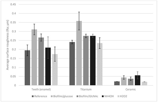 Treatment with NH4OH or H2O2 generally showed little to no effect on the Ra values for teeth or titanium. However, the ceramic disks had a relative increase of 154% Ra value for the NH4OH group, suggesting a particular sensitivity to alkali.