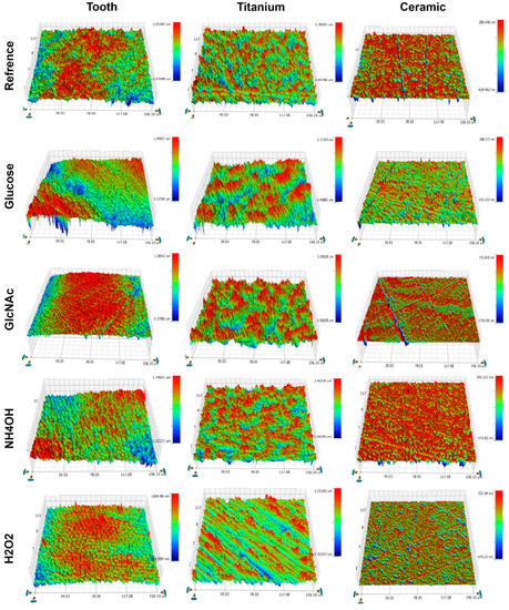 Subsequently, profilometry was performed on these 3 surfaces to assess the impact of biofilms and chemical erosion relative to untreated references. Overall measurements of surface roughness (Ra values in Figure 4, and 3D images in Figure 5) showed the highest relative change of Ra values on ceramic disks, followed by teeth and titanium disks (Table 1). Regarding the carbohydrates used in biofilm media, glucose resulted in a significantly greater increase in Ra values than GlcNAc, especially on ceramic, which had an almost 100% increase in relative roughness (Table 1), followed by teeth and titanium that each showed about a 50% increase in Ra value. Note that these changes in Ra values confirmed the above result of higher lactic acid production and lower pH values in biofilms formed with glucose than with GlcNAc. With the exception of ceramic disks treated with NH4OH, the glucose-treated samples exhibited the highest increase in relative Ra values.