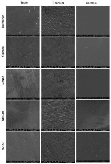 Human teeth and two restorative surfaces, titanium and ceramic, were treated for 30 days with CCS biofilms in the presence of either glucose or GlcNAc. pH of the spent culture media was monitored periodically, which showed similar trends throughout the 30-day period. A representative set of pH values are presented in Figure 3. Biofilm cultivated with GlcNAc consistently produced higher pH than those cultivated with glucose, which was consistent with the finding that GlcNAc resulted in reduced lactate and pyruvate production (Figure 2). Meanwhile, biofilms cultured together with human teeth had higher pH values than those cultured with two restorative materials, regardless of the sugar included in the medium. This result could be interpreted as the leaching of substances out of the teeth, e.g., calcium phosphate, which acted as a buffering reagent that impeded acidification of the medium. To assess the effects of metabolites other than acids, these three surfaces were similarly treated with 10 mM of NH4OH or 10 mM H2O2 for 30 days to assess the effect of these byproducts on the surfaces of teeth and restorative materials.