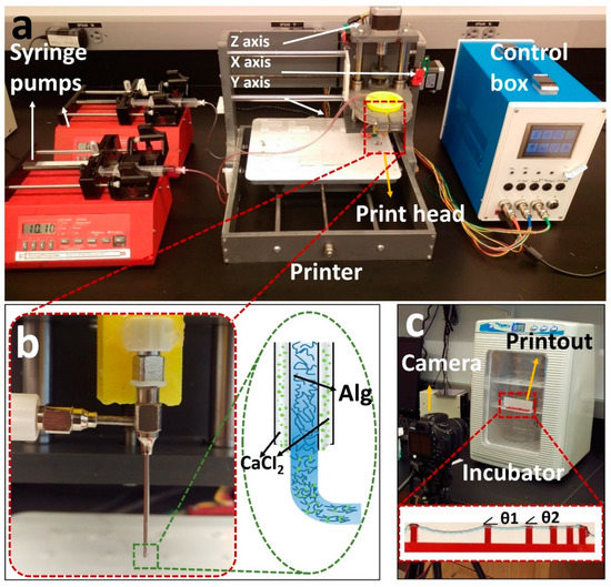 Overview of our custom-designed experimental setup. (a) Left to right: two commercial syringe pumps to extrude the hydrogel and crosslinker, a custom-made bioprinter using a CNC stage as a platform and a custom-made controller unit controlled via P.C. (b) Co-axial needle and schematic illustration of the printing process. Cell–alginate mixture and crosslinker (CaCl2) were deposited from the inner and outer needles, respectively. (c) Mini digital incubator with a camera to image the filament deformation.