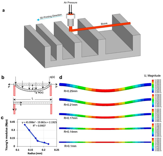 Figure 2c represents the relation between Young’s modulus and radius based on the theoretical model for 4% alginate at 37 °C. Young’s modulus of material increases as the filament radius decreases. As evaporation occurs from the filament, the ratio of solid to liquid increases, increasing Young’s modulus value. The dotted line represents the linear regression, giving the correlation between Young’s modulus and filament radius (R2 = 0.99), which assesses the elasticity modulus of filament in the condition of the known radius. Finite element analysis (FEA) modeling was performed using displacement magnitude for varying radii (Figure 2d). FEA replicated the experimental result by using data from the model. Upon application of the experimental data in the FEA, the displacements are obtained, which are shown in the legend bar next to each of the images and are consistent with the experimental results.