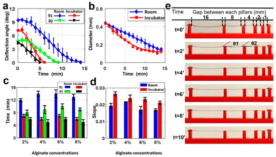 Figure 3c demonstrates the total time in which the deflection angles (θ1 and θ2) reached zero in room and incubator temperature for the four different alginate concentrations. Alginate concentration slightly affected the total time to reach zero angles, approximately 20% at room temperature and 12% at incubator temperature for both angles. Figure 3d shows the positive values of slopes correlating the diameter versus timeline, as seen in Figure 3b for both room and incubator temperature for the all-alginate concentrations. These results also showed that temperature effects on the diameter occur for different alginate concentrations. The change of diameter in the incubator had a bigger slope than at room temperature for all concentrations. This indicates that the diameter in the incubator decreased faster than the diameter at room temperature due to fast evaporation, as explained above. Representative images of printed filament with 4% alginate in the incubator are shown in Figure 3e. This shows the deflection and diameter changing over ten minutes.