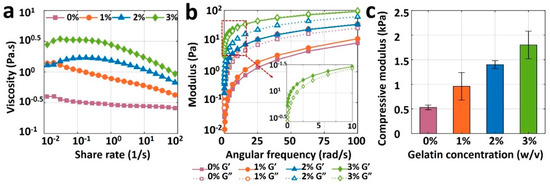 Results of rheological and mechanical characterization of bioinks. (a) Viscosities of 4% pure alginate (0% gelatin), and alginate with 1%, 2%, and 3% (w/v) gelatin, as a function of shear rate ranging from 0.01 to 100 s−1 (b) Storage modulus (G’) and loss modulus (G”) of all bioinks as a function of angular frequency ranging from 0 to 100 rad/s. (c) Compressive modulus of 3D-bioprinted and crosslinked samples with four different bioinks. A square of 10 mm-wide and 2 mm-thick sample was placed on the platform of dynamic mechanical analysis (DMA), and compression was performed until samples were yielded. The error bar is the standard deviation of 3 independent tests. p-value is 0.0015, ANOVA: single-factor.